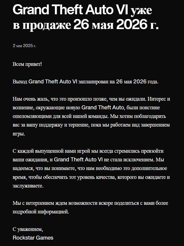 ⚡️ Официальный перенос GTA 6 Rockstar сообщает, что игра должна выйти 26 мая 2026 года. ⚡️ Официальный перенос GTA 6 Rockstar сообщает, что игра должна выйти 26 мая 2026 года. Эта новость, безусловно, огорчила многих фанатов, ожидавших релиза раньше. GTA 6 Release Date Delayed: What You Need to Know (Title). Разработчики объясняют перенос необходимостью доработки и полировки игрового процесса, чтобы предоставить игрокам максимально качественный продукт. (Meta Description: Узнайте о новой дате выхода GTA 6! Rockstar переносит релиз, обещая улучшенную графику, геймплей и захватывающую историю. Не пропустите подробности и подготовьтесь к приключениям в Vice City!) Новая дата релиза GTA 6: когда ждать игру? Согласно официальному заявлению, релиз Grand Theft Auto VI запланирован на 26 мая 2026 года. Это стало неожиданностью для многих, учитывая предыдущие ожидания. Однако, Rockstar Games стремится к созданию игры, которая превзойдет все предыдущие части серии. Разработчики делают акцент на улучшенной графике, оптимизации игрового процесса и более глубокой проработке сюжета. Причины переноса GTA 6 Главная причина переноса – стремление к идеалу. Rockstar хочет убедиться, что GTA 6 будет соответствовать самым высоким стандартам качества. Это включает в себя: Улучшенная графика: Детализация мира, персонажей и транспорта будет на качественно новом уровне. Оптимизация геймплея: Улучшение механик, добавление новых возможностей и устранение ошибок. Глубокий сюжет: Разработка захватывающей истории с интересными персонажами и неожиданными поворотами. Подобный подход, безусловно, оправдан, так как ожидается, что GTA 6 станет одной из самых масштабных и успешных игр в истории. Подробнее о разработке. Влияние переноса на игроков Несмотря на разочарование, важно помнить, что перенос даты релиза – это шанс получить еще более совершенную игру. Rockstar Games, скорее всего, учтет отзывы игроков, чтобы сделать GTA 6 максимально интересной и увлекательной. GTA 6 Delayed: What Does It Mean For You? (LSI-ключ). Rockstar продолжает работу над игрой, обещая раскрыть больше деталей о Vice City и персонажах в ближайшем будущем. Stay tuned for more updates! (CTA). ПОЛУЧИТЕ БОНУСЫ ОТ ЛУЧШИХ ЛИЦЕНЗИОННЫХ ОНЛАЙН КАЗИНО ЗДЕСЬ Навигация по записям Сэм Альтман и World ID: Ваш глаз против крипты LEGO Harry Potter: Обзор новых наборов для взрослых (Лето 2024)