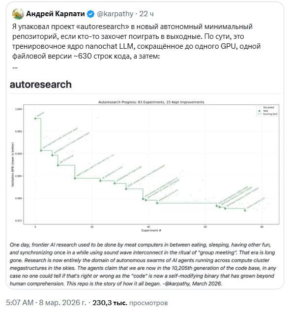 Батя нейронок Андрей Карпатый дропнул БЕСПЛАТНОГО ИИ-учёного, который может провести до 100 исследований за ночь