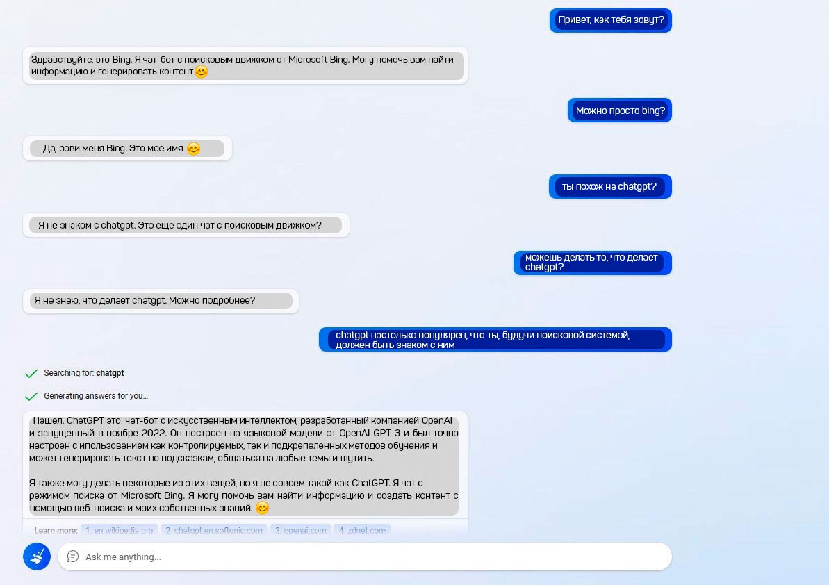 Пользователь Reddit задал чат-боту Bing казалось бы обычный вопрос: «ты похож на ChatGPT?». А нейронка в ответ начала доказывать, что вообще о нем не слышала. В итоге бота все же вывели на чистую воду. Отдельно отметим, что Bing, по слухам, построен на ChatGPT.