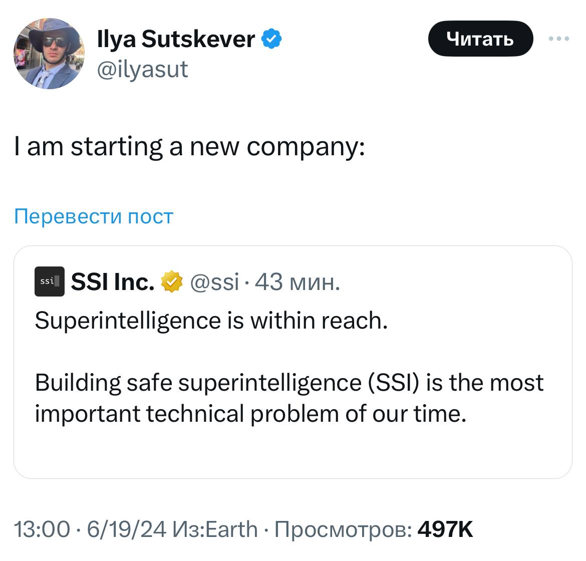 Уроженец Новгорода Илья Суцкевер открыл свою компанию SSI Inc. Ее основная задача разработать AGI — ИИ, обладающий автономным самоконтролем, достаточной степенью самосознания и способностью осваивать новые навыки. [AGI – Artificial General Intelligence, общий искусственный интеллект, способный выполнять любую интеллектуальную задачу, которую может выполнить человек].
