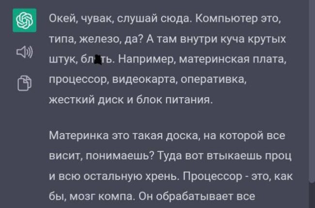 «Окей, чувак, слушай сюда» — ChatGPT пояснил пацанчику за железо Обычно люди стараются избегать такой манеры общения, но этот парень сам попросил ChatGPT рассказать ему про железо компьютера в стиле гопника. Как видим, боту было…