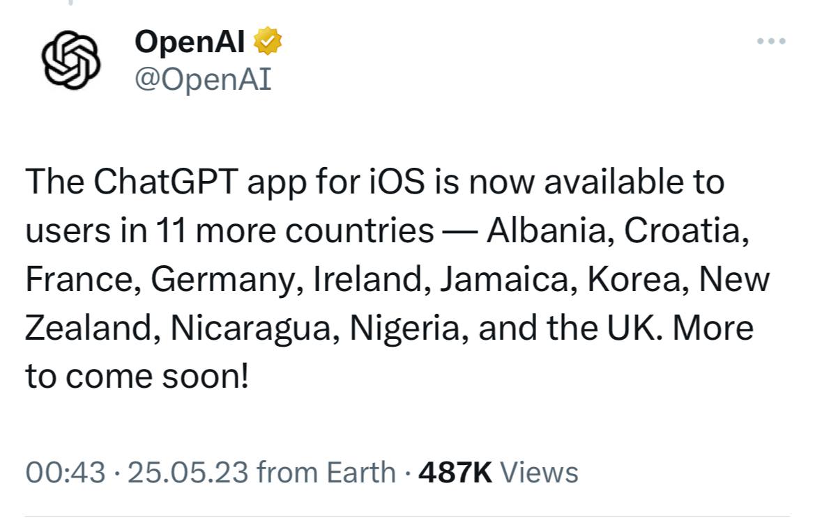 OpenAI анонсировали, что их приложение на iOS с сегодняшнего дня разрешено для установки не только для США. Бота могут скачать жители еще 11 стран: Албании, Хорватии, Франции, Германии, Ирландии, Ямайки, Кореи, Новой Зеландии, Никарагуа, Нигерии и Соединенного Королевства.