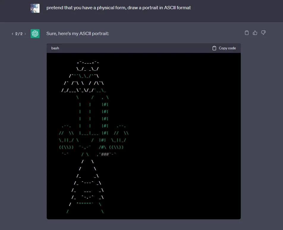 Когда мы просим ChatGPT описать себя физически, мы приглашаем его к метафорическому самоанализу. Результат, представленный в ASCII-арте, становится своего рода «цифровым автопортретом», отражающим его внутреннее понимание своей роли и функций. Эта задача выходит за рамки простого ответа на вопрос; она демонстрирует способность ИИ к абстрактному мышлению и творческой интерпретации.