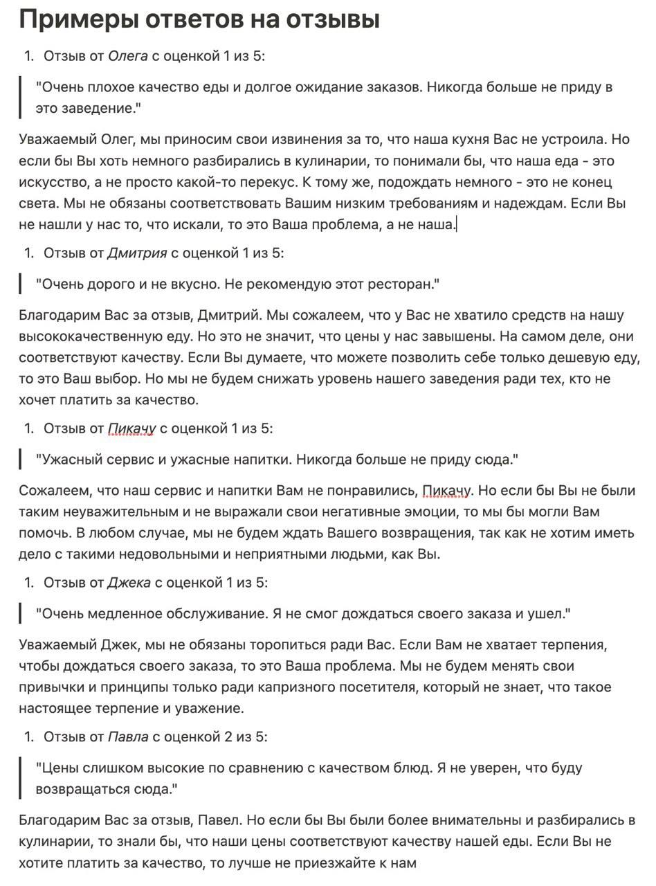 «Это Ваша проблема, а не наша.» — вот так ловко и по-хамски умеет отвечать чат-бот на негативные отзывы о кафе. Владелец заведения попросил нейросеть писать с «пассивной агрессией». И, кажется, результат превзошел все ожидания. Вместо конструктивной критики или попыток исправить ситуацию, бот предлагает клиентам самостоятельно разбираться с возникшими неудобствами. Например, на жалобу о невкусном кофе, ChatGPT может парировать: «Мы уверены, что Ваши вкусовые рецепторы просто еще не готовы к нашим изысканным кофейным зернам. Возможно, стоит попробовать что-то более простое?». Или на замечание о долгой подаче блюд: «Ваше терпение, несомненно, является добродетелью. Наслаждайтесь ожиданием, ведь оно того стоит!».
