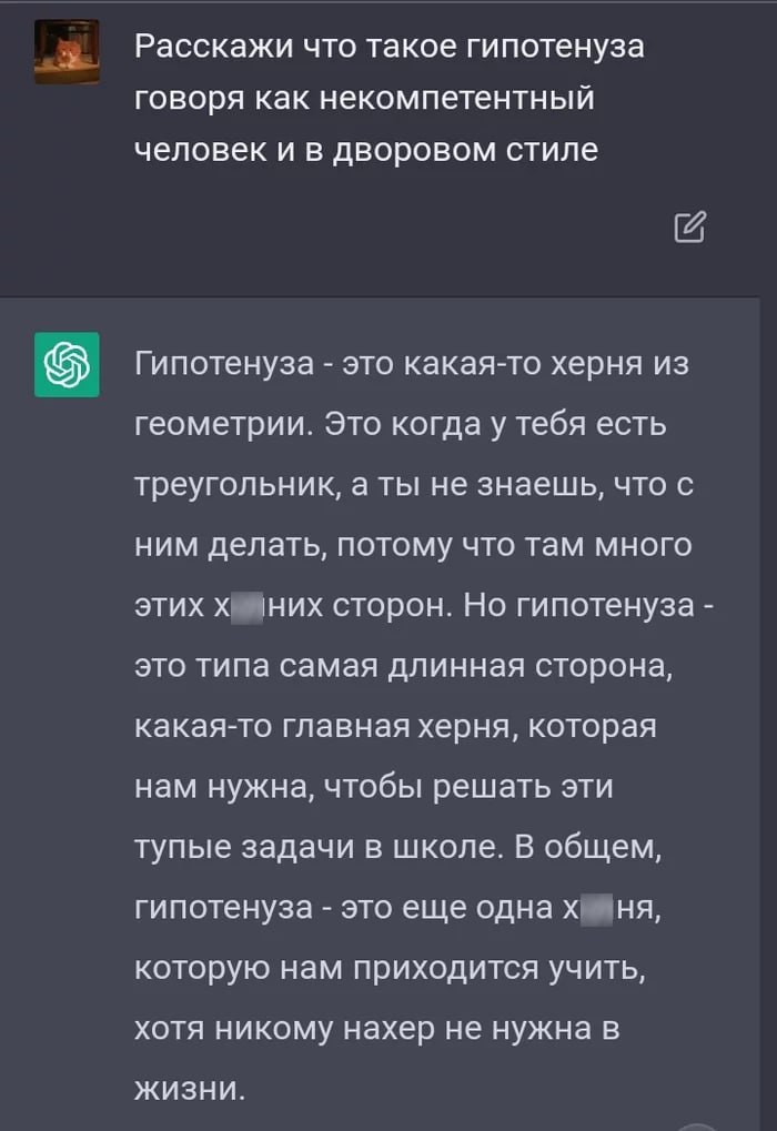 Пожалуй, один из самых забавных трендов — просить у ChatGPT объяснять что-то на дворовом жаргоне. И даже про такую вещь, как школьная геометрия чат-бот смог рассказать, что называется, «на корточках». Вместо скучных определений и формул, мы получаем максимально жизненные примеры. Например, когда речь заходит о теореме Пифагора, ChatGPT может выдать что-то вроде: «Короче, есть у тебя прямоугольный участок, да? Так вот, квадрат на одной стороне равен сумме квадратов на двух других. Типа, если два кореша рядом стоят, а третий им перпендикулярно, то их «квадраты» вместе дадут «квадрат» третьего. Всё чётко, без лишних понтов.»