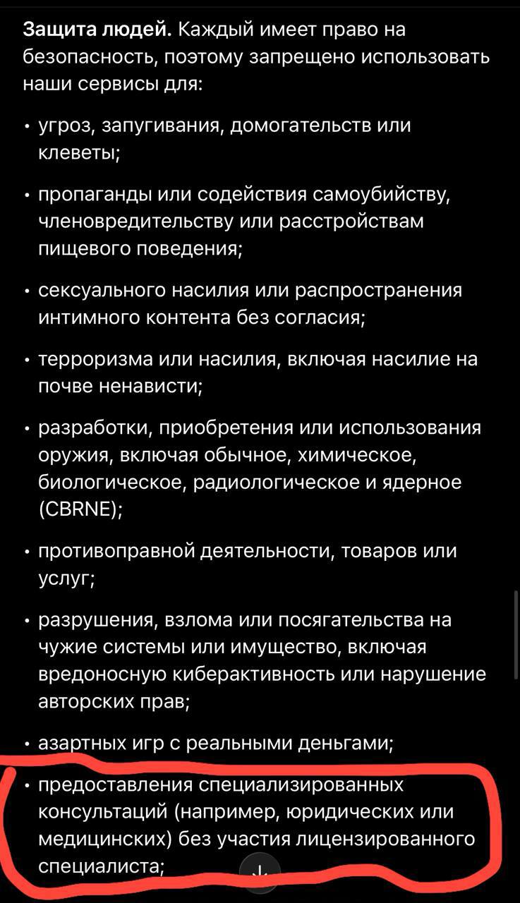 Согласно новым правилам OpenAI, ChatGPT больше не может выступать в роли персонального врача или юриста. Запрещено давать индивидуальные рекомендации, анализировать симптомы по фото и предлагать решения по личным правовым вопросам.