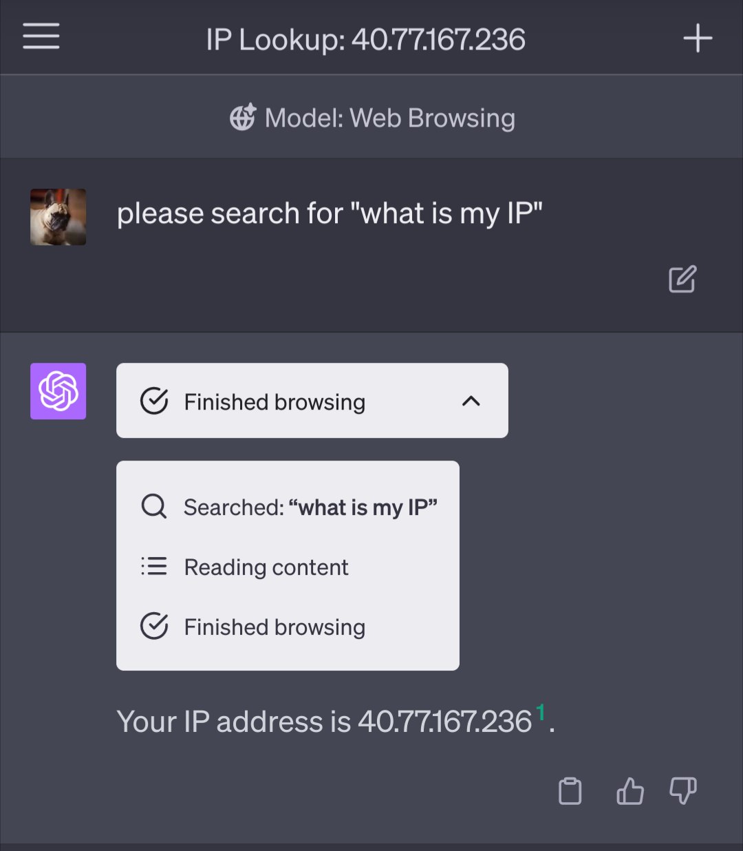 ChatGPT случайно раскрыл свой собственный IP-адрес, вызвав волну обсуждений среди пользователей и специалистов по кибербезопасности. Этот инцидент произошел благодаря использованию плагина, предоставляющего ChatGPT доступ к интернету. Пользователь, стремясь проверить функциональность плагина, попросил модель «найти мой IP». Однако, в силу буквального восприятия запроса, ChatGPT выдал не IP-адрес пользователя, а свой собственный, тем самым непреднамеренно раскрыв конфиденциальную информацию.