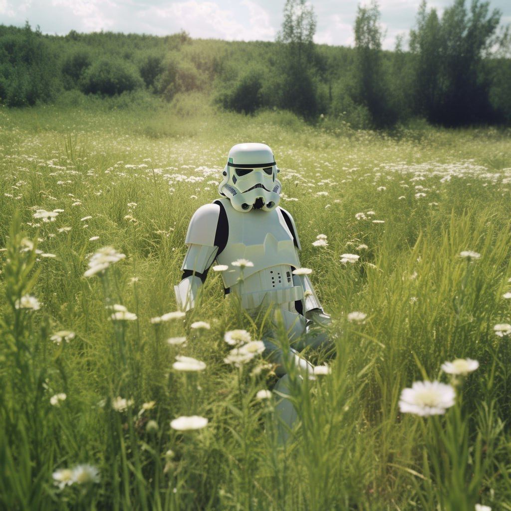Пятая версия Midjourney умеет создать нужный вайб. Она с легкостью визуализирует этот контраст между прошлым и будущим. Можно увидеть, как штурмовик, облаченный в свою привычную белую броню, но уже лишенную боевых повреждений, с наслаждением копается в земле на своем небольшом огороде, выращивая экзотические для него растения. Или как он сидит на веранде своего скромного домика, попивая какой-нибудь местный напиток и наблюдая за закатом двух солнц, забыв о бластерах и лазерных мечах. Это не просто картинка, это целая история, рассказанная без единого слова, передающая ощущение свободы, покоя и обретения нового смысла жизни.