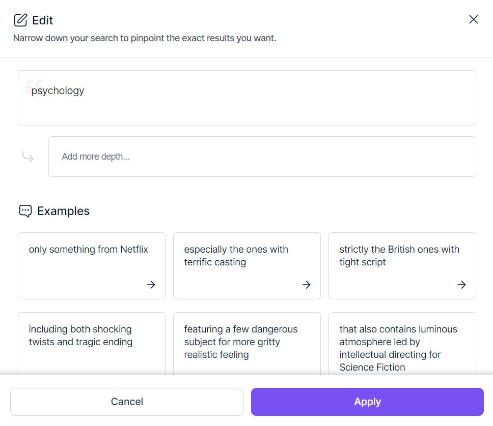 Поможет нам в этом крутая нейросеть Deep Search. На видео мы попросили выдать нам фильмы по теме «психология» и получили практически 6к результатов. Самое крутое, что запрос можно уточнять и кастомизировать вплоть до того, чтобы найти фильм по обрывкам описания. В сервис также встроено множество удобных сортировок, а интерфейс интуитивно понятен.