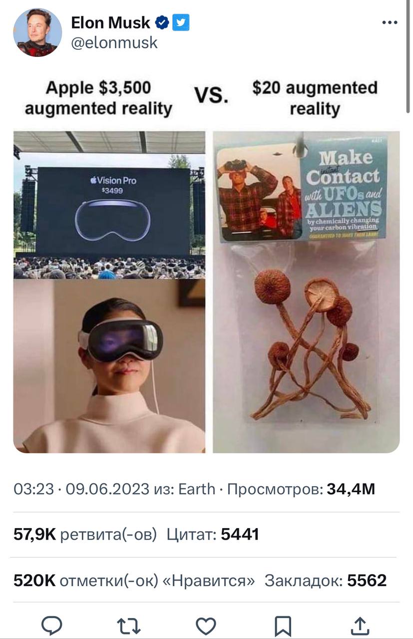 The wave of jokes about Vision Pro has even caught Elon Musk, demonstrating his reaction to the sensational announcement of Apple’s mixed reality headset. In his signature style, known for its directness and occasional provocativeness, Musk, the founder of SpaceX and Tesla, did not stay aside from the viral discussion. His comments, as often happens, instantly attracted the attention of millions of followers and generated new waves of memes and jokes on the internet.