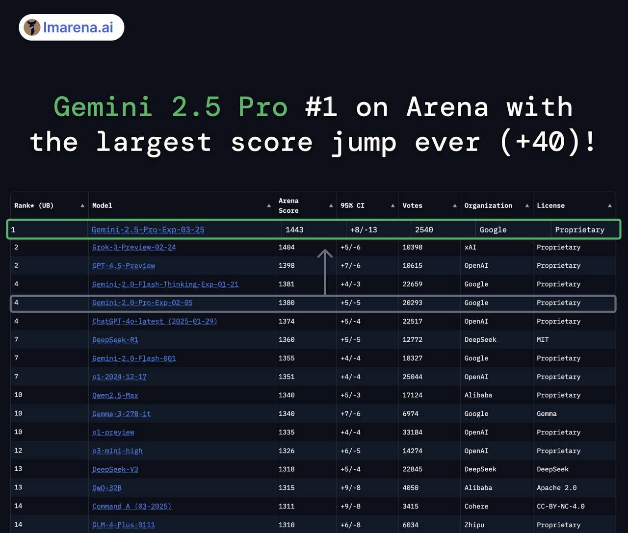 Нейронка опередила ВСЕХ на Арене и заняла лидирующие позиции в категориях «Hard Prompts» и «Coding». На бенчмарках тоже безоговорочная победа — назад были сдвинуты топовые o3-mini, GPT-4.5, R1, Sonnet 3.7, Grok-3.