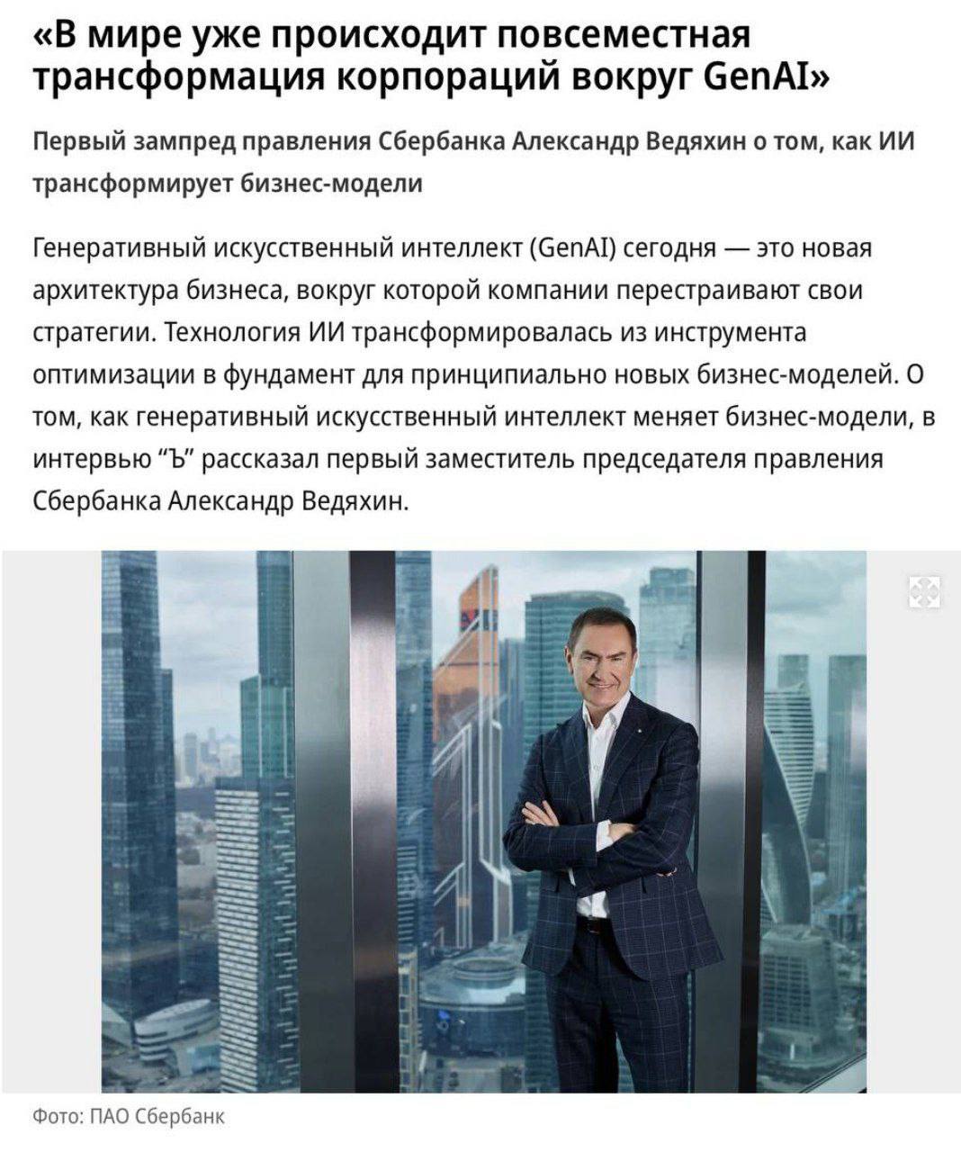 Первый зампред правления Сбера Александр Ведяхин рассказал, как ИИ меняет корпоративные процессы. По его словам, GenAI — это уже не просто инструмент, а фундамент новых бизнес-моделей. [Узнайте больше о влиянии GenAI на бизнес](https://example.com/genai-business).