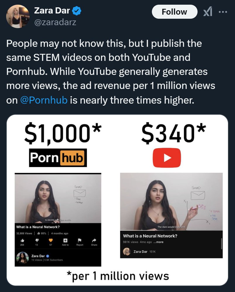 🍆 Гений математики начала выкладывать лекции по ИИ на порнхабе Зара Дар, бросившая обучение на докторскую степень ради OnlyFans, начала выкладывать копии своих лекций на популярный порносайт. Дело в том, что оранжево-черный YouTube платит гораздо больше за миллион просмотров чем обычный: $1000 против $340. Писать конспекты одной рукой не так уж и сложно. 🍆 Гений математики начала выкладывать лекции по ИИ на порнхабе Зара Дар, бросившая обучение на докторскую степень ради OnlyFans, начала выкладывать копии своих лекций по искусственному интеллекту на популярный порносайт. Дело в том, что оранжево-черный YouTube платит гораздо больше за миллион просмотров чем обычный: $1000 против $340. Этот нестандартный ход вызвал бурю обсуждений в академических кругах и среди фанатов ИИ. Писать конспекты одной рукой не так уж и сложно, особенно когда речь идет о финансовых стимулах. Подробнее о влиянии монетизации контента. Дар утверждает, что такой подход позволяет ей охватить более широкую аудиторию, включая тех, кто, возможно, никогда бы не заинтересовался наукой. Она использует платформу для распространения знаний, предлагая доступ к сложным концепциям в формате, который привлекает внимание. В ее лекциях рассматриваются темы от нейронных сетей до машинного обучения, адаптированные для начинающих. Ее цель – сделать образование более доступным и изменить представление о том, где можно получить знания. Get Your Free Consultation. ПОЛУЧИТЕ БОНУСЫ ОТ ЛУЧШИХ ЛИЦЕНЗИОННЫХ ОНЛАЙН КАЗИНО ЗДЕСЬ Навигация по записям Копчение мяса в ПК: Необычный способ использования компьютерного корпуса! Что нужно мужчинам: секрет восхищения