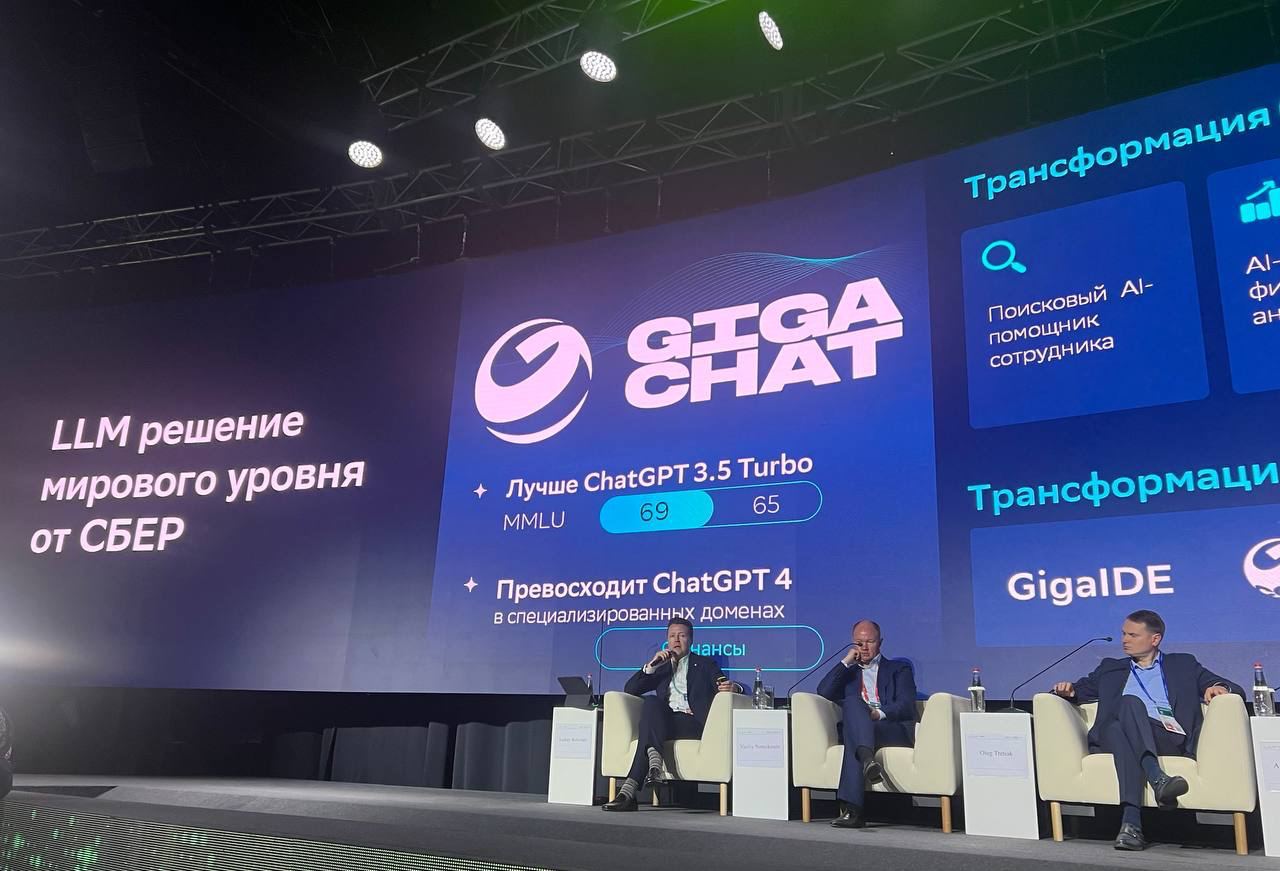 На ЦИПР Сбер показал возможности GigaChat в разных отраслях экономики. В рамках своего выступления, старший вице-президент и руководитель блока «Технологическое развитие» Сбербанка Андрей Белевцев продемонстрировал публике текущие успехи отечественной большой языковой модели: превосходство над ChatGPT 3.5 Turbo и даже над ChatGPT 4 в специализированных доменах.