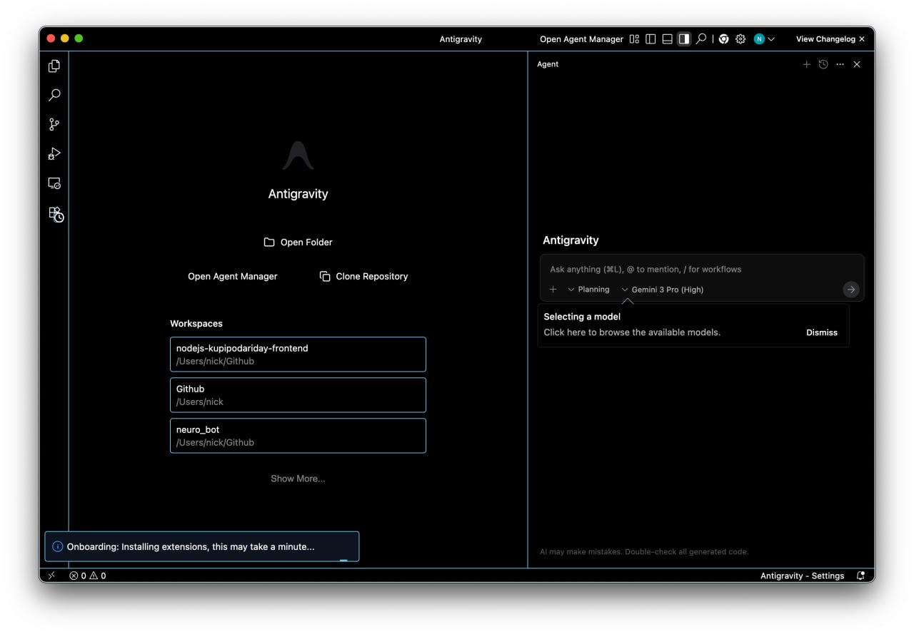 День сегодня насыщенный: еще Google выпустил Gemini 3, а потом выпустил Antigravity, свой аналог Cursor: Из особенностей: сразу стоит Gemini 3, он у меня проработал бесплатно примерно 3 минуты, потом — лимиты исчерпаны. Зато в этом IDE есть Sonnet 4.5 — пока работает бесплатно, попробуйте