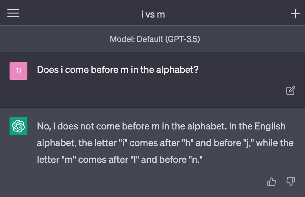 To illustrate these differences, we posed a seemingly simple question: «Does the letter ‘i’ come after the letter ‘m’ in the English alphabet?» This question, while straightforward for humans, serves as a revealing benchmark for the logical reasoning and contextual understanding of AI models.