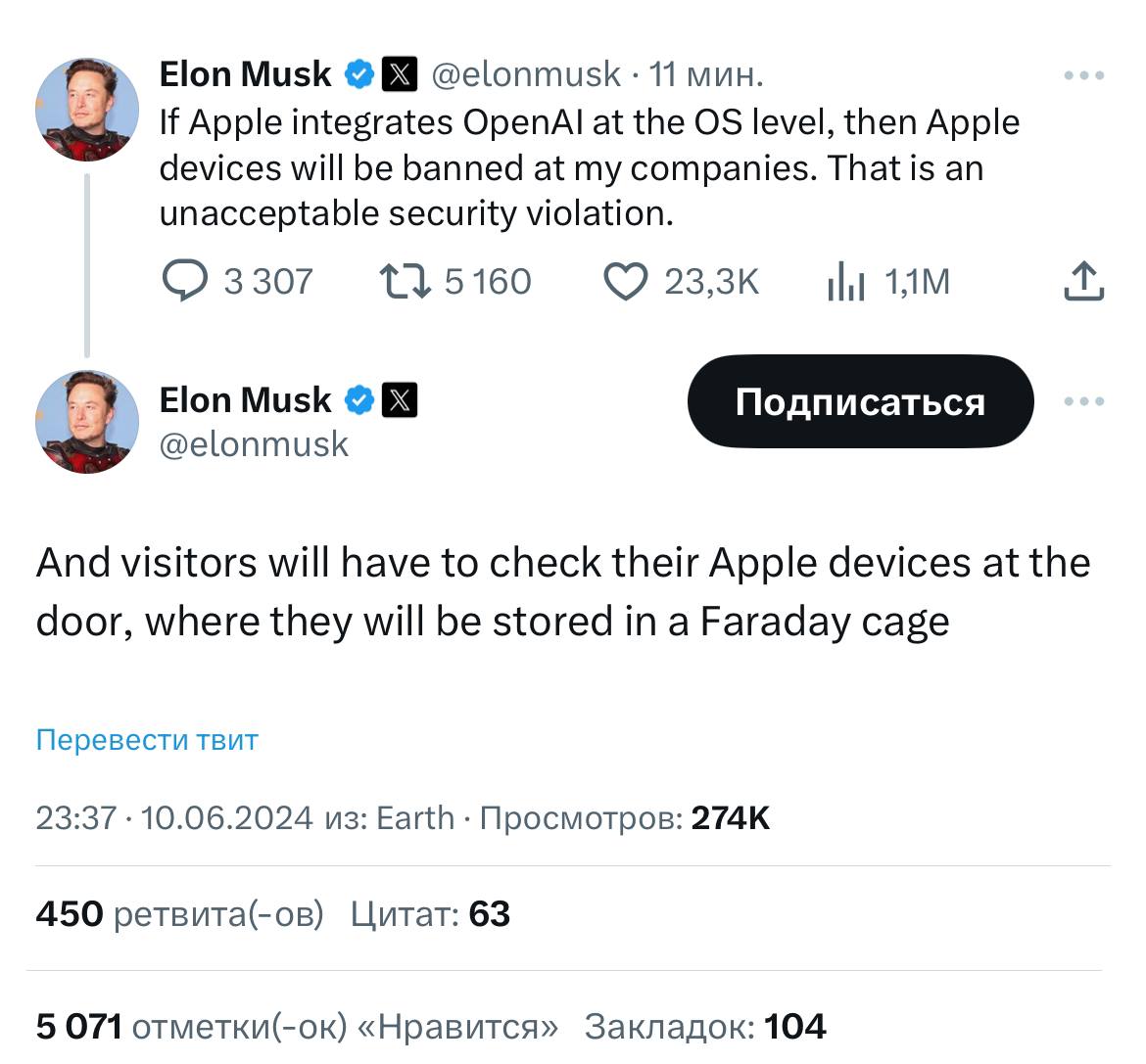 Если Тим Кук внедрит AI в свои гаджеты, то Илон Маск запретит Apple в своих компаниях