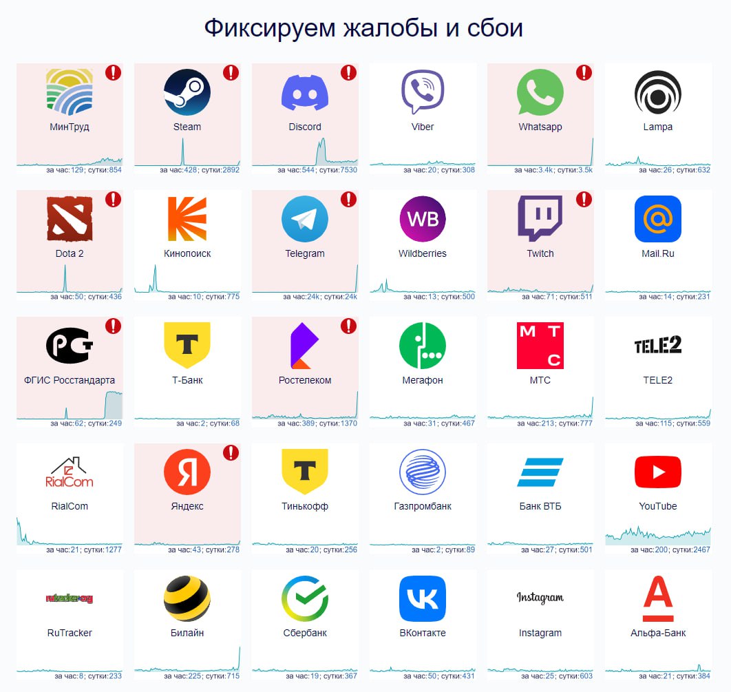 Сильные сбои наблюдаются у Telegram, WhatsApp, Discord, Twitch, Ростелеком и прочих крупных сервисов.