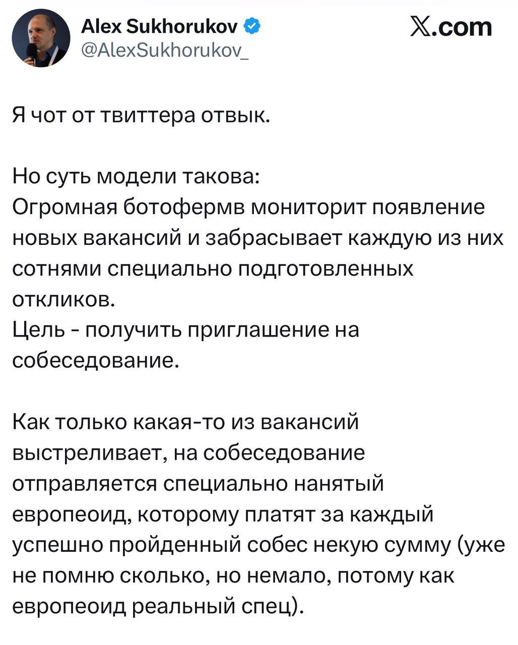 Программисты из поднебесной запускают бота, которые серчит вакансии и отправляет сотни идеальных резюме. На собес выходит сеньор-европеец, который получает % за успешное прохождение.