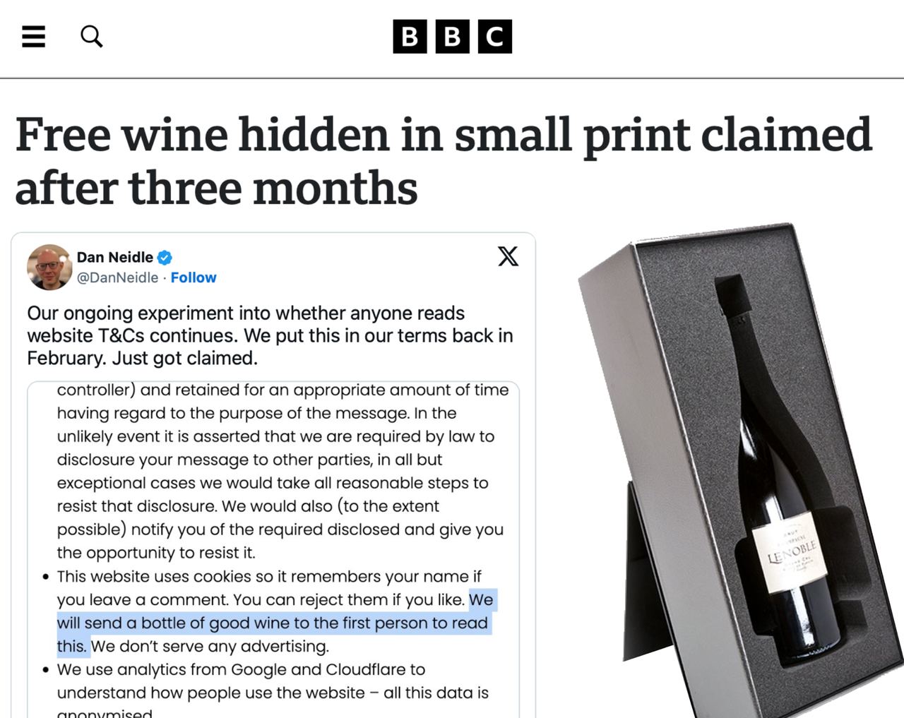 Парень бродил по интернету в поисках примера оформления «политики конфиденциальности» для сайта фирмы, на которую он работает. В процессе он случайно наткнулся на сайт компании из Великобритании, которая обещает бутылку отличного вина первому, кто прочитает ее политику.