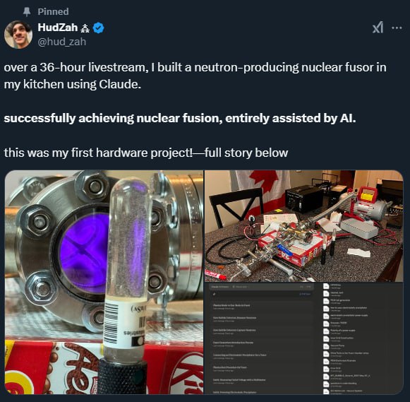 😯 Термоядерный реактор по гайдам от ИИ собрал у себя на дому канадский студент Парень нарыл в интернете документацию, скормил ее нейросети и в ответ она выдала инструкцию по монтажу реактора. Первая модель получилось нерабочей, но после дополнительного обсуждения проблемы с Claude и ChatGPT-4 все стало на свои места. Юный гений на пару с ИИ сконструировал у себя дома устройство, способное производить ядерный синтез — процесс, аналогичный тому, что происходит в звездах. Его девайс создает высокое напряжение, глубокий вакуум и использует дейтерий, чтобы заставить атомы сливаться, выделяя энергию и нейтроны. На всякий случай оговоримся: этот пост не является побуждением к действию 😮. Диджитальная 😯 Термоядерный реактор по гайдам от ИИ собрал у себя на дому канадский студент Парень нарыл в интернете документацию, скормил ее нейросети и в ответ она выдала инструкцию по монтажу реактора. Первая модель получилось нерабочей, но после дополнительного обсуждения проблемы с Claude и ChatGPT-4 все стало на свои места. Юный гений на пару с ИИ сконструировал у себя дома устройство, способное производить ядерный синтез — процесс, аналогичный тому, что происходит в звездах. Его девайс создает высокое напряжение, глубокий вакуум и использует дейтерий, чтобы заставить атомы сливаться, выделяя энергию и нейтроны. Этот эксперимент, несмотря на свою сложность, подчеркивает доступность информации и возможности, которые открывает искусственный интеллект. [Узнайте больше о ядерном синтезе](/yader-sintez/). Реактор, построенный студентом, представляет собой токомак – устройство, предназначенное для удержания плазмы магнитным полем. Используя дейтерий, тяжелый изотоп водорода, он смог добиться реакции синтеза, хоть и в небольших масштабах. Это впечатляющее достижение, демонстрирующее потенциал DIY-проектов в области физики. Важно понимать, что работа с ядерными материалами сопряжена с серьезными рисками. Неправильное обращение может привести к радиационному заражению. Тем не менее, сам факт сборки реактора в домашних условиях – это яркий пример того, как энтузиазм и доступ к информации могут привести к поразительным результатам. На всякий случай оговоримся: этот пост не является побуждением к действию 😮. Диджитальная ПОЛУЧИТЕ БОНУСЫ ОТ ЛУЧШИХ ЛИЦЕНЗИОННЫХ ОНЛАЙН КАЗИНО ЗДЕСЬ Навигация по записям Cyberpunk 2077: Отдых после Рабочей Недели Наконец-то нормальная система охлаждения для ПК