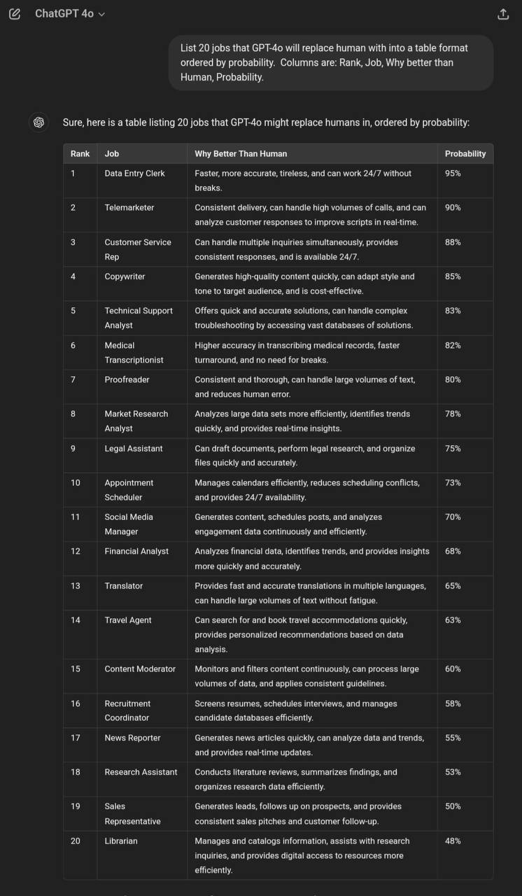 Кого сможет заменить нейросеть: Анализ GPT-4o У новой модели попросили составить списки профессий, которые она вскоре сможет или, наоборот, не сможет заменить. В список претендентов на замену традиционно попали СММ-щики и копирайтеры. Похоже, GPT-4o не в курсе, что у нее за спиной пару дней назад OpenAI начали искать к себе в штат кожаного СММ-щика. Кого, по мнению GPT-4o, сможет заменить нейросеть У новой модели попросили составить списки профессий, которые она вскоре сможет или, наоборот, не сможет заменить. В список претендентов на замену традиционно попали СММ-щики и копирайтеры. GPT-4o, анализируя огромные объемы данных, вероятно, учитывала способность к автоматизации рутинных задач, свойственную этим профессиям. Например, генерация контента, планирование публикаций и базовое взаимодействие с аудиторией. Похоже, GPT-4o не в курсе, что у нее за спиной пару дней назад OpenAI начали искать к себе в штат кожаного СММ-щика. Это, вероятно, говорит о понимании OpenAI важности человеческого фактора: креативности, эмпатии и способности к стратегическому мышлению, которые сложно автоматизировать. Подробнее о роли SMM в эпоху AI. И хотя GPT-4o может генерировать тексты и идеи, настоящая магия SMM заключается в умении строить отношения с аудиторией и понимать ее потребности на глубинном уровне. Стоит отметить, что в список потенциальных «заменителей» также попали дизайнеры, аналитики данных и разработчики. Однако, учитывая текущие тенденции, эти профессии, скорее всего, трансформируются, а не исчезнут. Discover More about the future of work! ПОЛУЧИТЕ БОНУСЫ ОТ ЛУЧШИХ ЛИЦЕНЗИОННЫХ ОНЛАЙН КАЗИНО ЗДЕСЬ Навигация по записям Рыбак нанял рыбу на работу: Необычный эксперимент Suno AI: Песня про цитаты Джейсона Стетхема — Угарный Мем Трек