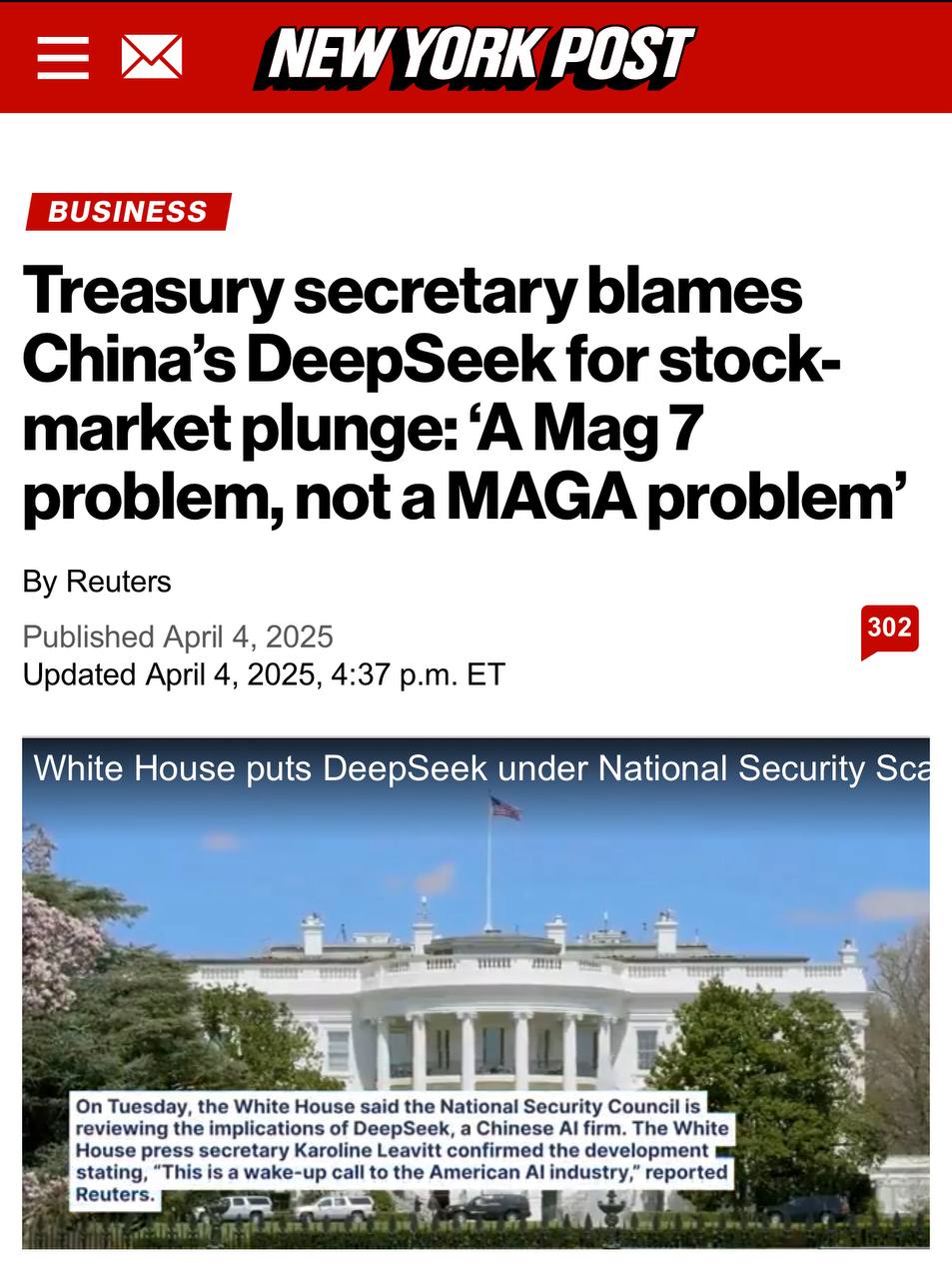 Крах американских фондовых рынков происходит из-за DeepSeek К таком выводу пришел министр финансов США. Он назвал это проблемой Mag-7: семерка техно-гигантов, состоящих из Meta*, Apple, Google, Amazon, Microsoft, Nvidia, and Tesla опозорилась после появления дешевого и мощного DeepSeek — инвесторы поняли, что их обманывали и разработка топовых моделей стоит гораздо дешевле. Акции компаний из-за этого, по мнению министра, закономерно начали коррекцию. Партия довольна. *признана экстремистской и запрещена в РФ. ПОЛУЧИТЕ БОНУСЫ ОТ ЛУЧШИХ ЛИЦЕНЗИОННЫХ ОНЛАЙН КАЗИНО ЗДЕСЬ Навигация по записям Адаптации для «The Россиян»: Обзор новых генераций Создание Action Figure: Новый тренд в LinkedIn
