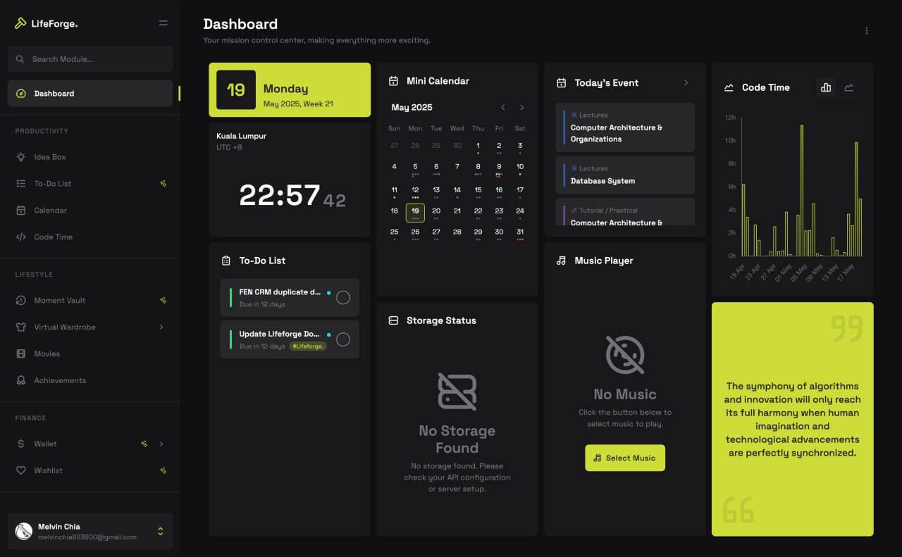 LifeForge объединяет множество сервисов в одном месте: планирование задач, трекинг привычек, заметки, финансы, цели, обучение, дневник и ещё десятки инструментов. Это идеальное решение для тех, кто хочет оптимизировать свою жизнь, повысить продуктивность и достигать поставленных целей.