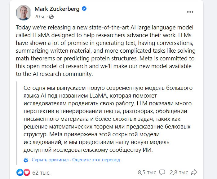 В своем фейсбуке Марк Цукерберг анонсировал новую языковую модель. Имя ей LLaMA. Она должна стать конкурентом ChatGPT, а также помогать ученым. Преимущества перед конкурентами заключается в меньшей требовательности к энергетическим ресурсам. При этом, как утверждается, LLaMa в тестах превосходит GPT-3.