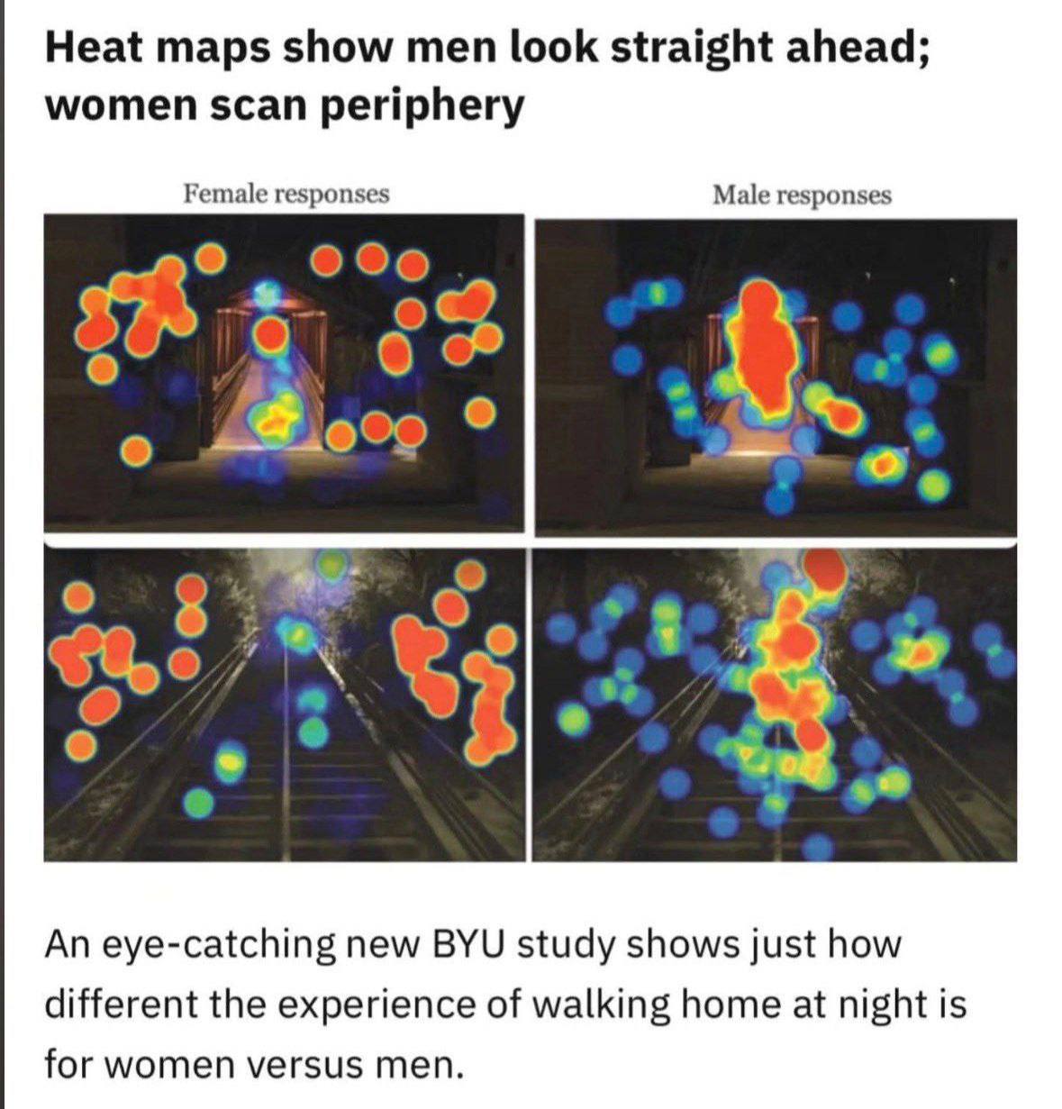 Исследователи провели эксперимент: они показывали представителям обоих полов фотографии ночных тропинок. Затем участников теста попросили отметить зоны, которые сразу приковали их внимание: