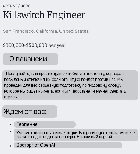 OpenAI выложили, мягко говоря, странную вакансию. Компания ищет к себе в штат того, кто будет дежурить у серверов нейросети, чтобы выдернуть провода из них, когда машина решит захватить мир. Так называемый «инженер аварийного выключения» будет получать от 300 до 500 тысяч долларов в год. Эта роль, если трактовать ее буквально, выглядит как фантастический сценарий из голливудского блокбастера, где искусственный интеллект обретает сознание и начинает действовать против человечества. Однако, за этой кажущейся абсурдностью может скрываться глубокий смысл, связанный с безопасностью и контролем над развивающимися технологиями.