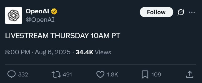 OpenAI анонсировали «LIVE5TREAM». Уже завтра в 20:00 по МСК мы, вероятно, увидим GPT-5 — новую мощнейшую модель от Альтмана.