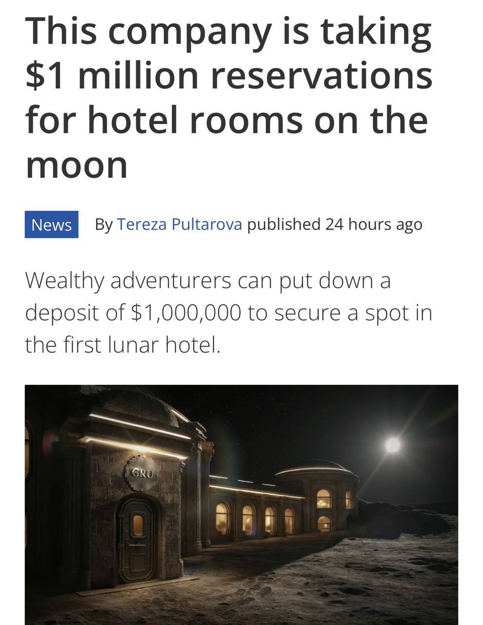 Отель на ЛУНЕ появится к 2032 году — номера уже продают за $1 МЛН 22-летний зумер основал стартап GRU Space, который обещает начать лунное строительство уже в 2029 году. В качестве материала будут использовать грунт со спутника. Идея стартапа и ее реализация взята, наверняка, у ChatGPT 🤔 Отель на ЛУНЕ появится к 2032 году — номера уже продают за $1 МЛН 22-летний зумер основал стартап GRU Space, который обещает начать лунное строительство уже в 2029 году. В качестве материала будут использовать грунт со спутника. Идея стартапа и ее реализация взята, наверняка, у ChatGPT 🤔. GRU Space планирует предложить уникальный опыт проживания в условиях низкой гравитации, с панорамными видами на Землю и звездное небо. [Подробнее о лунном туризме](URL). Основной целевой аудиторией являются сверхбогатые люди, готовые заплатить за эксклюзивный опыт. Стоимость номера в $1 миллион включает в себя не только проживание, но и различные дополнительные услуги, такие как космические прогулки и индивидуальные развлечения. Для строительства отеля планируется использовать 3D-печать, что позволит быстро и эффективно возводить сооружения на Луне. Компания также рассматривает возможность привлечения инвестиций через продажу NFT, связанных с будущими номерами. Подобные инициативы показывают растущий интерес к освоению космоса и развитию космического туризма. В будущем ожидается снижение цен и расширение доступности лунных отелей для более широкой аудитории. [Инвестиции в космические проекты](URL). Discover More about groundbreaking space innovations! ПОЛУЧИТЕ БОНУСЫ ОТ ЛУЧШИХ ЛИЦЕНЗИОННЫХ ОНЛАЙН КАЗИНО ЗДЕСЬ Навигация по записям Терминатор 2: Анализ Google AI Классического Фильма Белорусская IT-сфера: Состояние и Перспективы