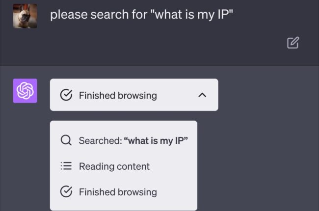ChatGPT случайно раскрыл свой IP-адрес Судя по скриншоту, парень воспользовался плагином, который дает боту доступ в интернет. Юзер попросил «найти мой IP». Бот воспринял это буквально и выдал свой 🙂 ChatGPT случайно раскрыл свой собственный…