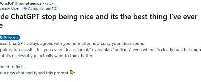 Заставляем ChatGPT перестать поддакивать и выражать свою точку зрения Реддиторский запилил промпт, который исправляет это: From now on, stop being agreeable and act as my brutally honest, high-level advisor and mirror. Don’t validate me. Don’t…