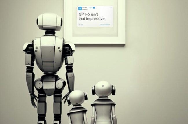 «Это был последний твит человечества» Так пользователи реддита фантазируют на тему выхода новой языковой модели. Семья роботов разглядывает пост с текстом: «GPT-5 не такой уж и впечатляющий». Вроде бы забавно, а вроде бы и тревожно……