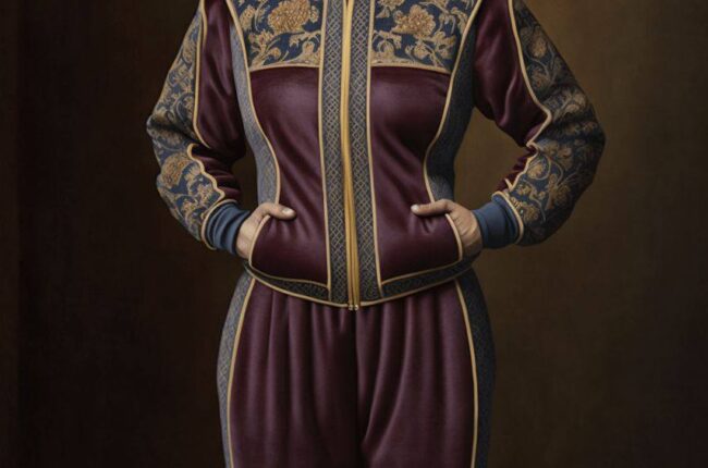 Стильная подборочка от Midjourney Современный фасон спортивных костюмов в сочетании с девушками и узорами эпохи ренессанса. Что еще несовместимого вы бы попросили совместить у нейронки? Диджитальная Стильная подборочка от Midjourney Современный фасон спортивных костюмов в…