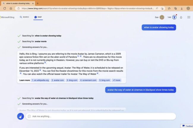 ChatGPT начинает страдать галлюцинациями Пользователь спросил у ИИ-бота, где показывают «Аватар 2», на что ChatGPT через Bing ответил, что фильм ещё не вышел, он выйдет в 2023 году. На вопрос “какой сейчас год” бот ответил…