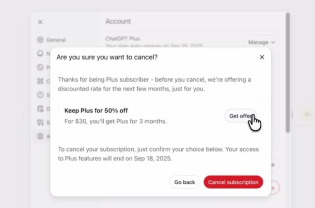 В сети нашли халяву от OpenAI — скидка на ChatGPT Plus В личном кабинете, в настройках, отменяем подписку и получаем предложение на продление со скидкой 50%. Возможен фикс, поэтому не упускаем возможность. В сети нашли…