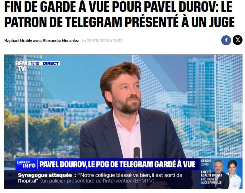 Следственный судья прекратил содержание основателя Telegram в полиции с целью его первичного допроса и возможного предъявления обвинения. Это означает, что Павла Дурова больше не удерживают под стражей в полицейском участке.