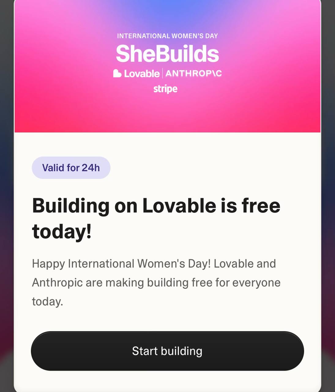 Думал, что бы вам подарить, но Lovable меня опередили) Сегодня они дарят 24 часа вайбкодинга: Акция действует сутки — я проверил, действительно можно создавать сайты и приложения без оплаты. С праздником! цветок