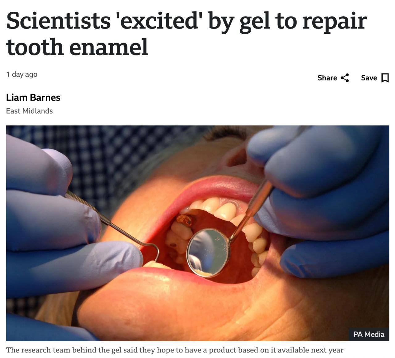 Достаточно его нанести на поврежденную эмаль и она будет регенерировать. Первые этапы испытаний прошли успешно, скоро проведут на людях. Фух, можно не брать кредит на стоматолога.