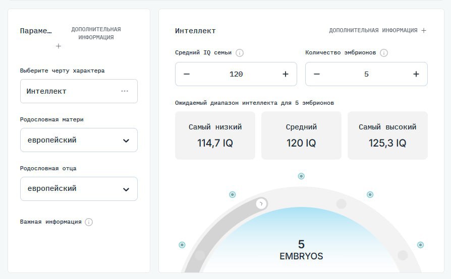 Стартап Herasight сделал калькулятор, где вы вводите данные, а он показывает риск и прогноз — буквально прокачка атрибутов и диаграмма статов в ролевой игре. С помощью этого инструмента, потенциальные родители могут оценить вероятность развития определенных заболеваний и предполагаемый уровень интеллекта будущего ребенка, словно настраивая персонажа в компьютерной игре.