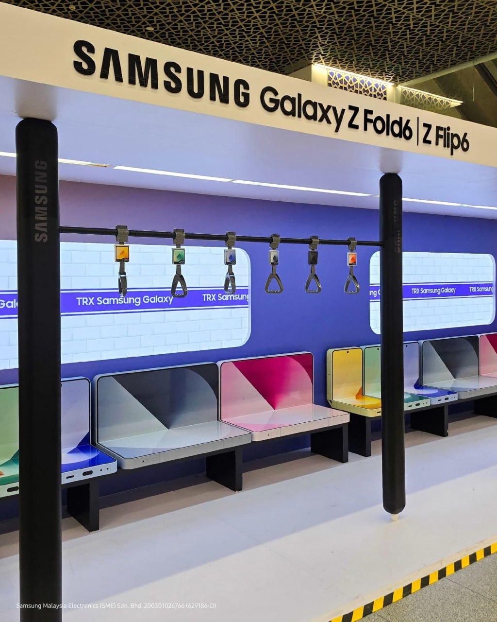 Островки ожидания поезда полностью забрендированы под новые телефоны-раскладушки. Это смелый шаг в маркетинге, превращающий повседневную рутину в рекламную площадку. Samsung Malaysia использовала метрополитеновую инфраструктуру для демонстрации своих инновационных устройств, особенно складных смартфонов.