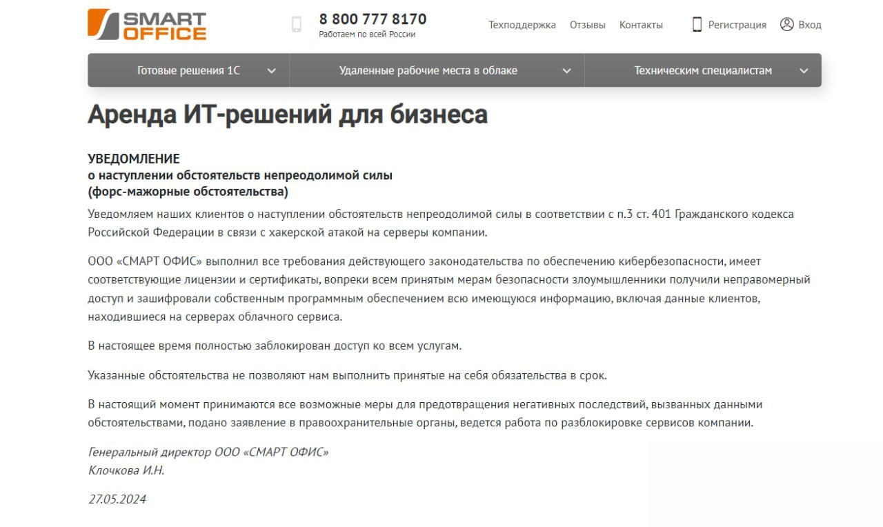 СДЭК — не единственная жертва хакеров На этот раз под удар попала компания «Смарт офис», которая специализируется на обслуживании серверов 1С по всей России. Злоумышленники зашифровали ВСЕ данные. Пока что их расшифровали лишь частично. Есть риск полной утери некоторой информации. СДЭК — не единственная жертва хакеров На этот раз под удар попала компания «Смарт офис», которая специализируется на обслуживании серверов 1С по всей России. Злоумышленники зашифровали ВСЕ данные. Взлом серверов 1С – серьезная угроза для бизнеса, особенно для компаний, полагающихся на бесперебойную работу критически важных бизнес-процессов. Пока что их расшифровали лишь частично. Есть риск полной утери некоторой информации. Кибер-атаки на компании, предоставляющие услуги в сфере IT, становятся все более распространенными. [Узнайте больше о кибербезопасности](https://example.com/cybersecurity/). Подобные инциденты подчеркивают необходимость в усилении мер защиты данных и регулярном резервном копировании. Помимо шифрования данных, хакеры часто прибегают к краже конфиденциальной информации, что может привести к значительным финансовым потерям и репутационному ущербу. Важно отметить, что атаки на серверы 1С могут парализовать работу компаний, лишив их доступа к финансовым данным, клиентской базе и другим важным ресурсам. В связи с этим, необходимо уделять особое внимание обновлению программного обеспечения, использованию надежных антивирусных решений и проведению регулярных аудитов безопасности. Защита от подобных угроз требует комплексного подхода, включающего в себя как технические, так и организационные меры. Discover More about data protection! ПОЛУЧИТЕ БОНУСЫ ОТ ЛУЧШИХ ЛИЦЕНЗИОННЫХ ОНЛАЙН КАЗИНО ЗДЕСЬ Навигация по записям Очки-смартфоны Уголовная ответственность за дипфейк в России