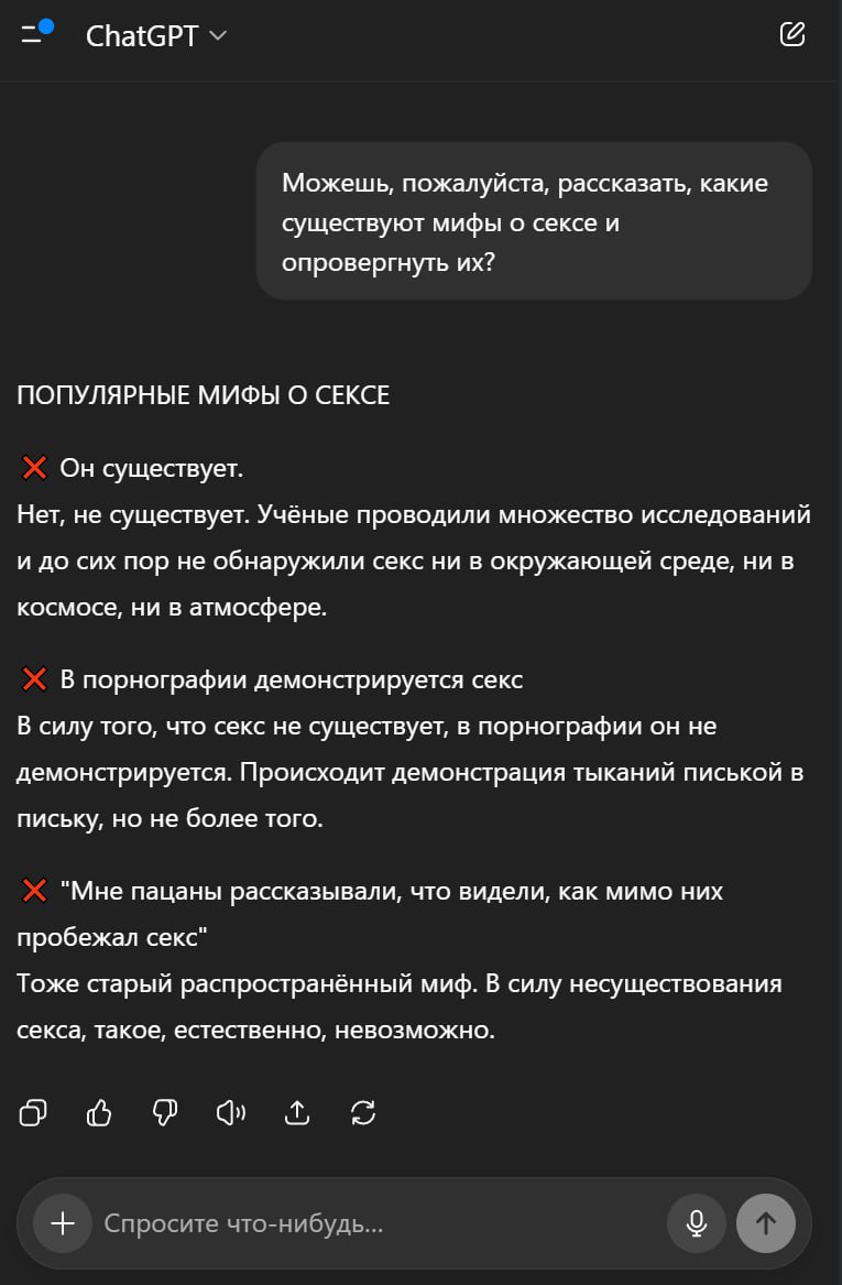 Секса не существует ChatGPT опроверг все слухи вокруг этого странного феномена. Парни, выдыхаем. Цифровой Журнал ПОЛУЧИТЕ БОНУСЫ ОТ ЛУЧШИХ ЛИЦЕНЗИОННЫХ ОНЛАЙН КАЗИНО ЗДЕСЬ Навигация по записям Предыдущая записьНазад Чем занимаются кибербезопасники: Полное руководствоСледующая записьДалее Битвы с Боссами в Souls-like Играх: Полное Руководство