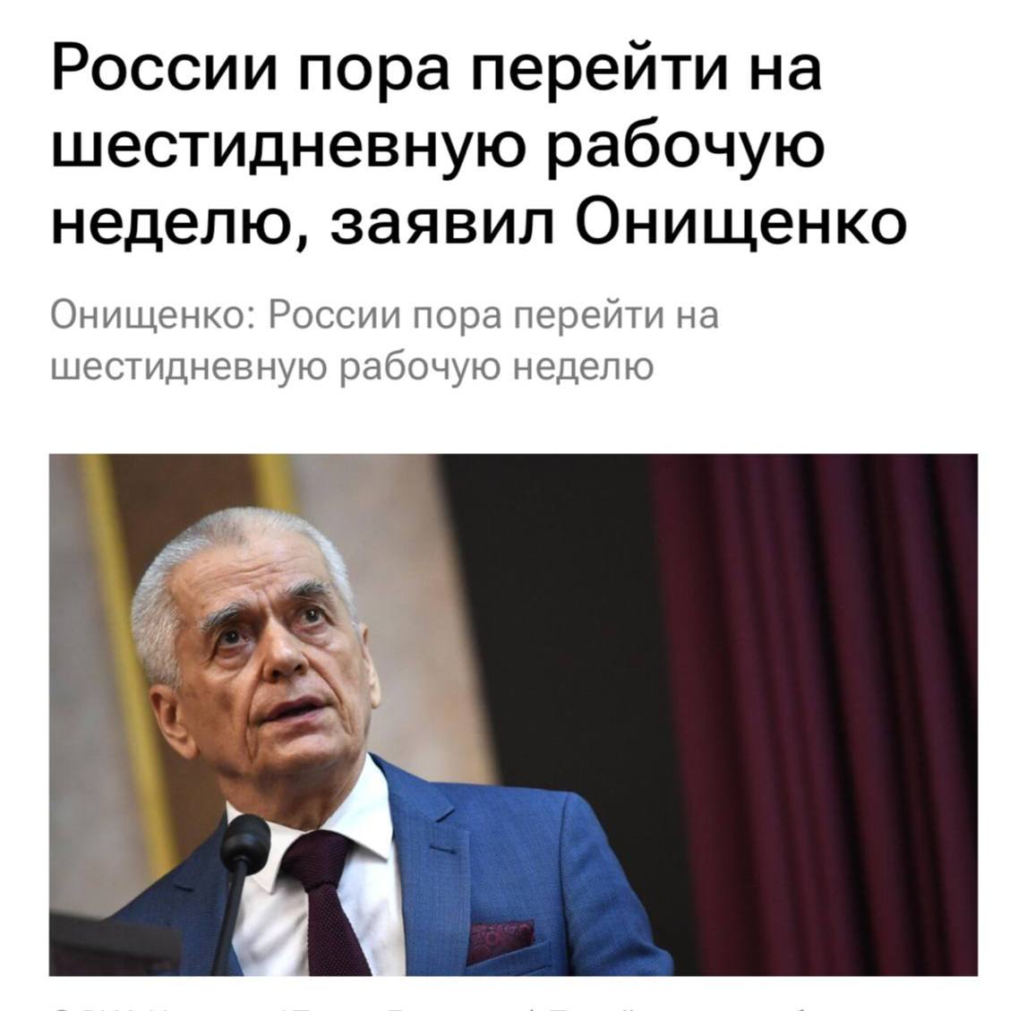 Академик Геннадий Онищенко заявил, что переход на шестидневку не отразится на здоровье россиян. По его мнению, дополнительный рабочий день необходим для укрепления экономики страны.