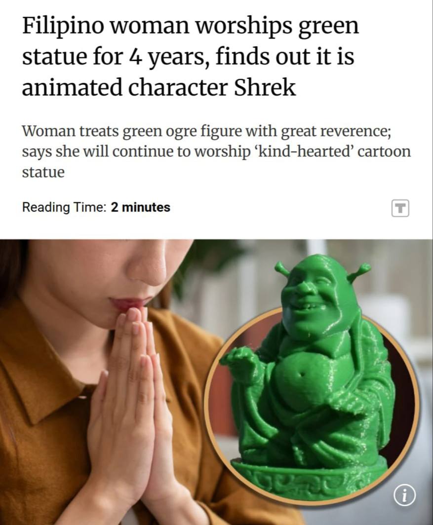 Женщина 4 года молилась ШРЕКУ — она купила «статуэтку Хотэя» в местной лавке на Филиппинах. Из-за округлой формы и мягкой улыбки она была уверена, что перед ней божество счастья и веселья. Женщина поставила Шрека на домашний алтарь и поклонялась ему каждый день. Обман раскрылся, когда это увидел один из ее гостей.