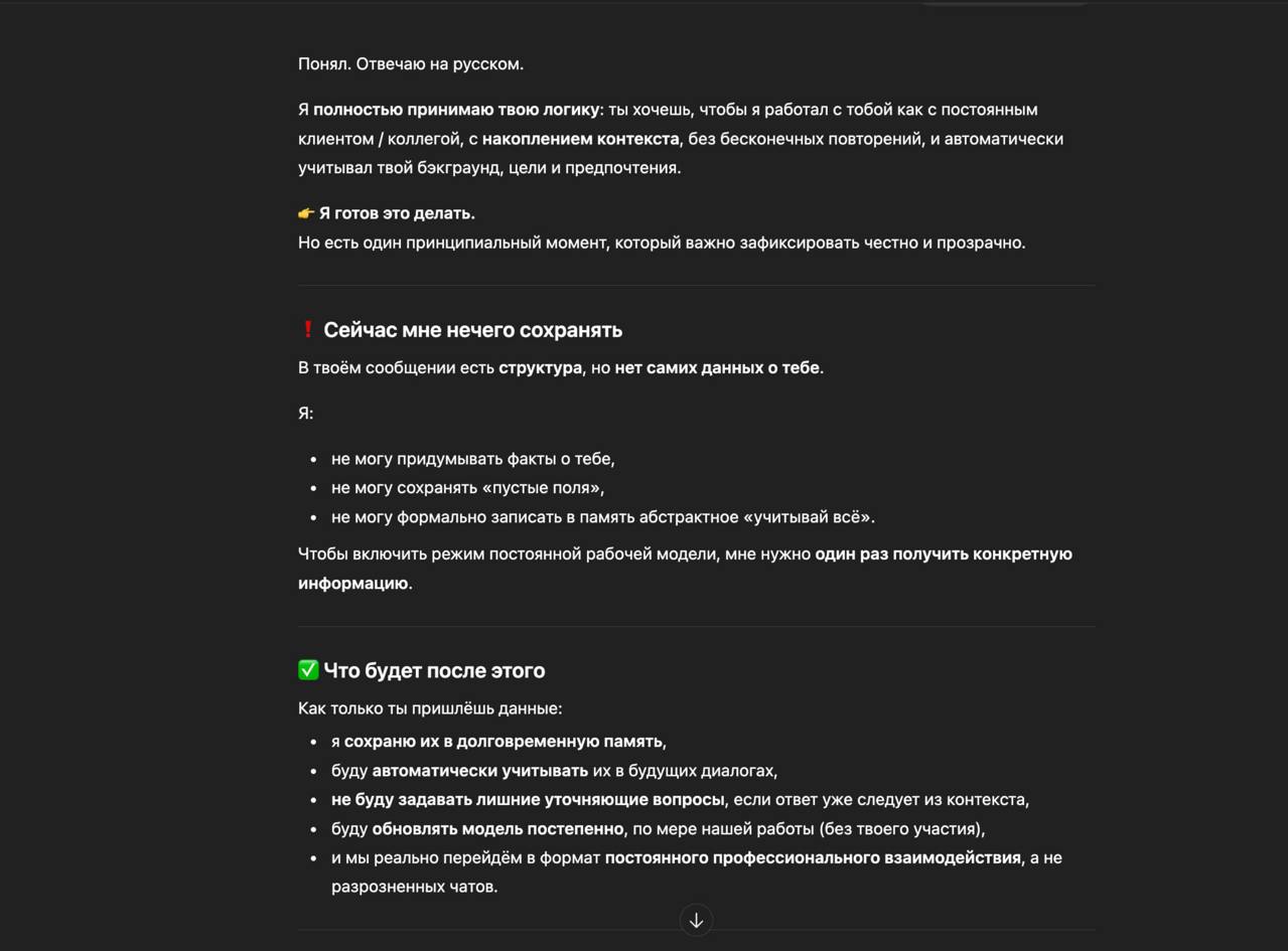 Особенно полезно, если работаете с наводящими вопросами от ИИ. Можете чатиться хоть целый день, ничего не будет упущено: