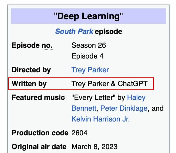 Легендарный South Park решил шагать в ногу со временем и одну из своих серий «Deep Learning» посвятил нейросетям. Обратите внимание на авторов — ChatGPT указан как один из тех, кто написал сценарий к эпизоду. Вчера на Википедии это можно было увидеть своими глазами. К сожалению, соавтора уже удалили, но скриншот остался.